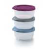 Sistema de encaixe na tampa: As tigelas menores se encaixam e travam perfeitamente nas tampas das tigelas maiores, facilitando a organização e o transporte.
